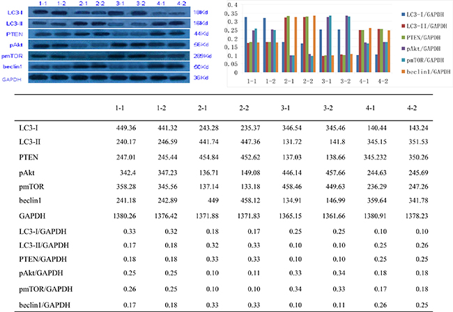 Figure 4: The expression of LC3-I, LC3-II, PTEN, p-AKT, pmTOR and beclin1. 1-1,1-2: Ishikawa cells; 2-1, 2-2: Ishikawa-PR cells; 3-1, 3-2: Ishikawa cells with miR-205 inhibitor; 4-1, 4-2: Ishikawa-PR cells with miR-205 inhibitor