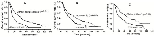 Nasopharyngeal carcinoma (NPC) is sensitive to radiotherapy and chemotherapy. Although excellent disease control rates have been achieved in patients with NPC after comprehensive treatments, local recurrence remains a major cause of treatment failure, particularly in patients with advanced disease [1-3]. Salvage treatments with curative intent have improved long-term survival in selected patients with locally recurrent NPC. These mainly involve aggressive surgery or re-irradiation [4]. Successful outcomes have been reported following salvage surgical resection and brachytherapy in cases of limited disease or localized in the nasopharynx [5, 6]. Stereotactic radiotherapy (SRT) proved effective in cases involving relatively small tumor volumes (diameter ≤3 cm) [7-9]. However, the majority of locally recurrent NPC were presented with extensive invasion, limiting the choice of effective salvage treatments. Re-irradiation with external beam radiotherapy remains the principle modality. Conventional radiotherapy is often difficult and results in poor survival and high incidence of severe late complications due to the impact of high dose primary radiation on critical organs located in the vicinity of the nasopharynx [10, 11]. In contrast, intensity-modulated radiotherapy (IMRT) offers a more favorable balance between target coverage and the sparing of adjacent organs [12, 13]. IMRT has proved feasible in cases of locally recurrent NPC; therefore, the aim of this study was to assess the long-term survival benefits and late radiation-induced toxicities in locally recurrent T3-T4 NPC who had undergone re-irradiation with IMRT.