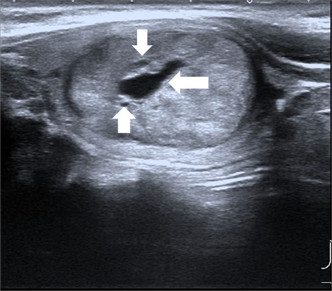Figure 1: Male patient, 33 years old, MEN 2 MTC. Lesion was oval in shape, with well-defined margin, mixed echogenicity, some cystic changes (arrows).