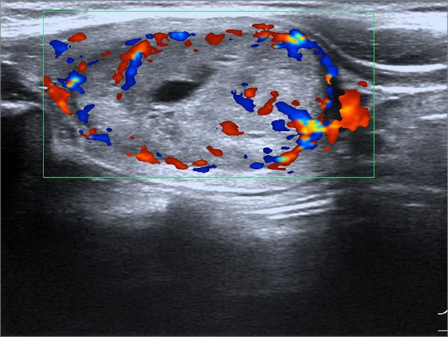 Figure 4: Female patient, 35 years old, sporadic MTC. Lesion had aspect ratio < 1, enhanced blood flow.