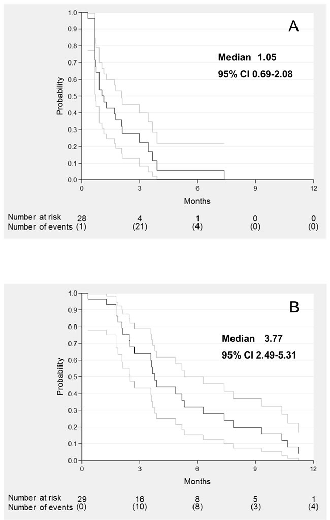 Median PFS was 1.05 months (95%CI 0.69-2.07) (Figure 1A) and median OS was 3.77 months (95%CI 2.49-5.31) (Figure 1B).