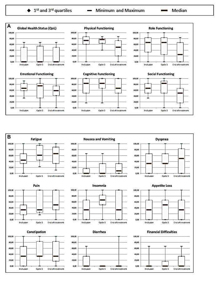 Patient-reported outcomes were assessed using the European Organization for Research and Treatment of Cancer (EORTC) Quality of Life Questionnaire (QLQ-C30) and the head and neck cancer-specific supplementary module (QLQ-H&N35) at the onset of treatment, at third cycle and at the end of treatment.
