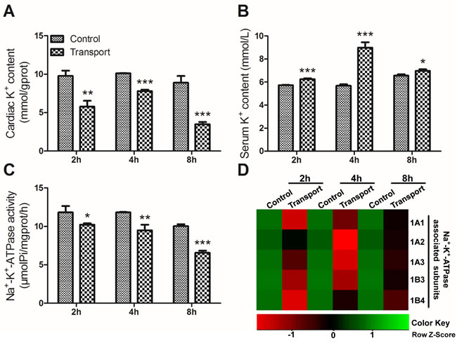 Figure 1: Effects of transport stress on the modulation of K+ transfer channel. A. The K+ content in cardiac myocytes of the chicks; B. The K+ content in the serum of the chicks; C. The Na+-K+-ATPase activity in cardiac myocytes of the chicks; D. The heat-map of mRNA expression levels of Na+-K+-ATPase associated subunits in heart. Values were expressed as mean ± S.D.. Symbol for the significance of differences between the transport group and control group: *P < 0.05, **P < 0.01 and ***P < 0.001. The mRNA expression levels of genes transcription are shown using the indicated pseudo color scale from -1 (green) to +1 (red) relative to values for control group. The Row Z-Score represents the relative mRNA expression levels, with the green indicating up-regulated genes, the red indicating down-regulated genes, and black indicating unchanged genes.