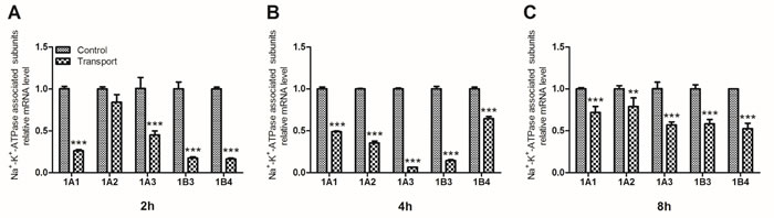 Figure 2: Effects of transport stress on the mRNA expression levels of Na+-K+-ATPase associated subunits in chicks heart. A. 2h; B. 4h; C. 8h. Values were expressed as mean ± S.D.. Symbol for the significance of differences between the transport group and control group: *P < 0.05, **P < 0.01 and ***P < 0.001.