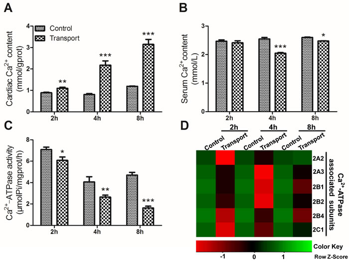 Figure 3: Effects of transport stress on the modulation of Ca2+ transfer channel. A. The Ca2+ content in cardiac myocytes of the chicks; B. The Ca2+ content in the serum of the chicks; C. The Ca2+-ATPase activity in cardiac myocytes of the chicks; D. The heat-map of mRNA expression levels of Ca2+-ATPase associated subunits in heart. Values were expressed as mean ± S.D.. Symbol for the significance of differences between the transport group and control group: *P < 0.05, **P < 0.01 and ***P < 0.001. The mRNA expression levels of genes transcription are shown using the indicated pseudo color scale from -1 (green) to +1 (red) relative to values for control group. The Row Z-Score represents the relative mRNA expression levels, with the green indicating up-regulated genes, the red indicating down-regulated genes, and black indicating unchanged genes.