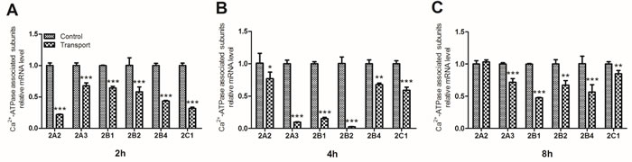 To investigate the unique transcriptional response to transport stress, a heat map showing the mRNA expression levels of the six Ca2+-ATPase associated subunits in the transported chicks was presented in Figure 3D. The transcription of the Ca2+-ATPase subunits was down-regulated evidently after the chicks were transported for 2h, 4h and 8h. The gene expression levels of the six Ca2+-ATPase associated subunits were notablely decreased in the 2h (P < 0.001; Figure 4A) and 4h transport groups (P < 0.05, P < 0.01 or P < 0.001; Figure 4B). Additionally, a remarkable decrease of the mRNA expression levels of a set of Ca2+-ATPase subunits (2A3, 2B1, 2B2, 2B4 and 2C1) was observed in the 8h transport group.