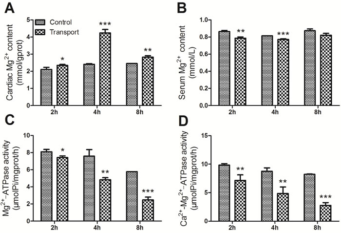 Figure 5: Effects of transport stress on the modulation of Mg2+ transfer channel. A. The Mg2+ content in cardiac myocytes of the chicks; B. The Ca2+ content in the serum of the chicks; C. The Mg2+-ATPase activity in cardiac myocytes of the chicks; D. The Ca2+-Mg2+-ATPase activity in cardiac myocytes of the chicks. Values were expressed as mean ± S.D.. Symbol for the significance of differences between the transport group and control group: *P < 0.05, **P < 0.01 and ***P < 0.001.