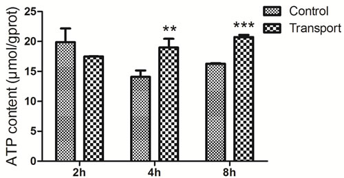 The alterations of ATP content were presented in the Figure 6. Significant increases in the ATP content were observed in the 4h (P < 0.01) and 8h (P < 0.001) transport group compared to that of the corresponding control groups, whereas no notable difference was found in the 2h transport group.