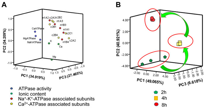 The results of PCA of biochemical indices in the heart of chicks subjected to the transport showed that some of the Na+-K+-ATPase associated genes (1A1, 1B3 and 1B4), Ca2+-ATPase associated gene (2A3) might play important roles in response to the heart injury induced by transport stress (Figure 7A). In addition, as an unsupervised pattern recognition method, PCA was used to distinguish potential effects of biochemical parameters in chicks transported for different time periods. The PCA scores revealed a notably time-dependent separation within the transported chicks. Moreover, the changes in metabolic profiles from 2h to 4h and 8h went on in a counterclockwise direction when these changes were obviously separated from the 2h transport group (Figure 7B). That is to say, these results indicated that the changes induced by the transport stress might be time-dependent.
