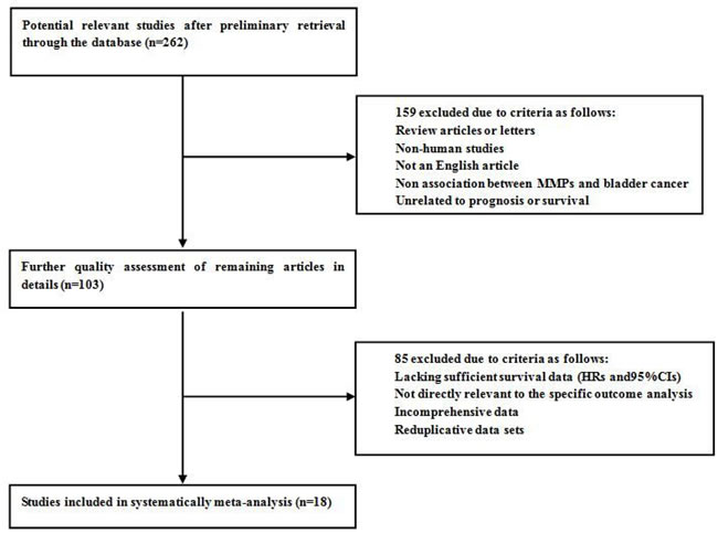As is shown in Figure 1, a total of 262 studies from PubMed, EMBASE, and the Web of Science were found to focus on the relationship between MMPs expression and bladder carcinoma. After initial screening of titles and abstracts, 159 studies were excluded because: they did not focus on the specific association of MMPs expression and bladder cancer, were review articles or non-English articles, or did not include human subjects. After applying this criteria to filter the remaining 103 studies, 85 potentially suitable studies were excluded because they lacked sufficient survival data (HRs and 95% CIs), were not relevant to the outcome analysis, did not report comprehensive data, or had reduplicative data sets. Ultimately, eighteen studies were considered applicable to this meta-analysis. The inclusion and exclusion reasons for the screened studies are summarized in detail in Figure 1.