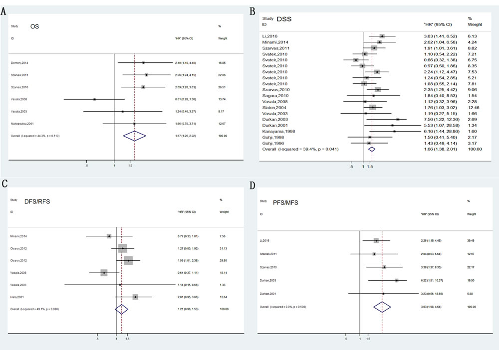 Figure 2: Forrest plots of merged analyses of high MMP expression as compared to low expression. Survival data are reported as overall survival (OS) A. and disease-specific survival (DSS) or cancer-specific survival (CSS) B., disease-free survival (DFS) or relapse-free survival (RFS) C., progress-free survival (PFS) or metastasis-free survival (MFS) D.
