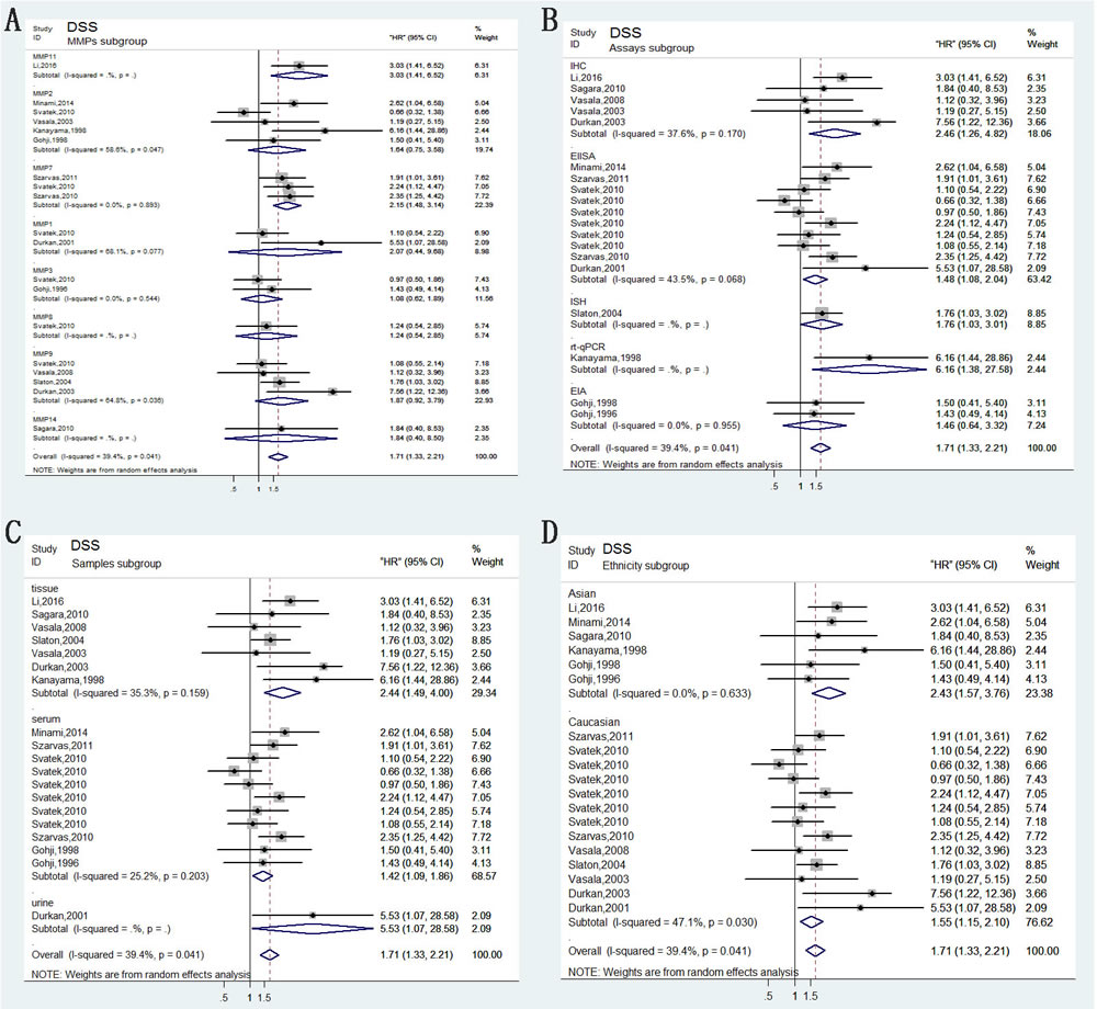 Compared with OS, DSS can better reflect the outcomes of bladder carcinoma. Fourteen of the studies analyzed DSS. No heterogeneity between these studies was observed (P = 0.055, I2 = 35%); thus, a fixed-effects model was applied to calculate a pooled HR along with 95% CI. Our analysis revealed that high expression of MMPs correlated with shorter DSS (HR=1.66, 95%CI=1.38–2.01; Figure 2B). In addition, characteristics like MMPs type, assay methods, dominant ethnicity, and type of samples were divided into subgroups for analysis; calculated results were exhibited in detail in Figure 4.