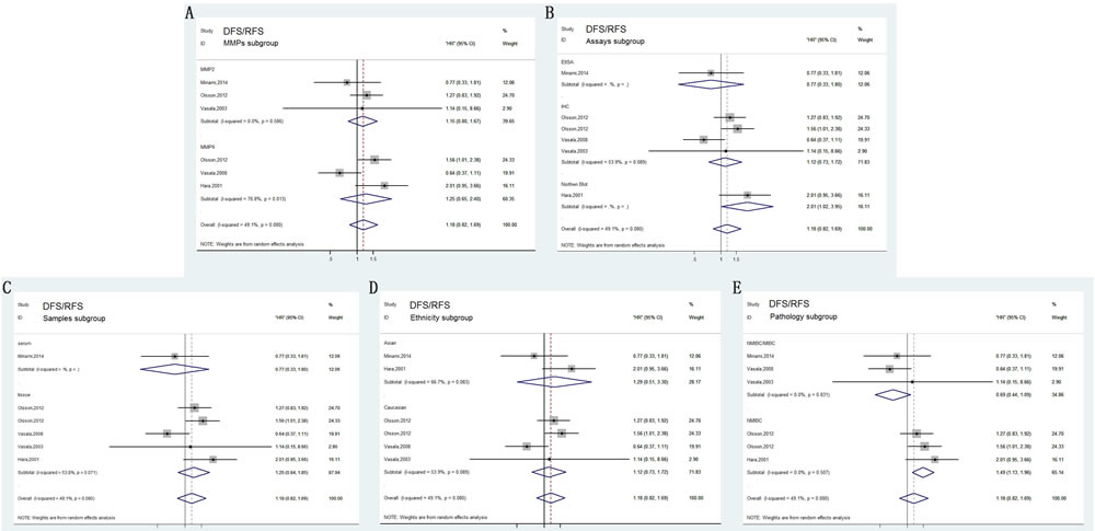 Figure 5: Forest plots of subgroup analysis of the DFS/RFS. A. stratified by MMPs subgroups; B. stratified by Assay methods; C. stratified by Sample subgroups; D. stratified by Ethnicity subgroups; E. stratified by Pathology subgroups.