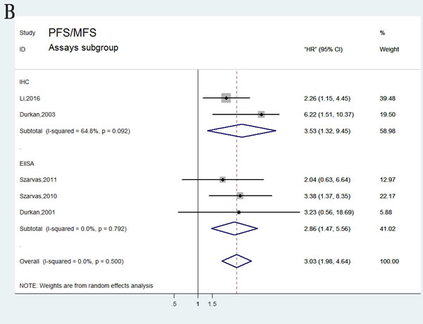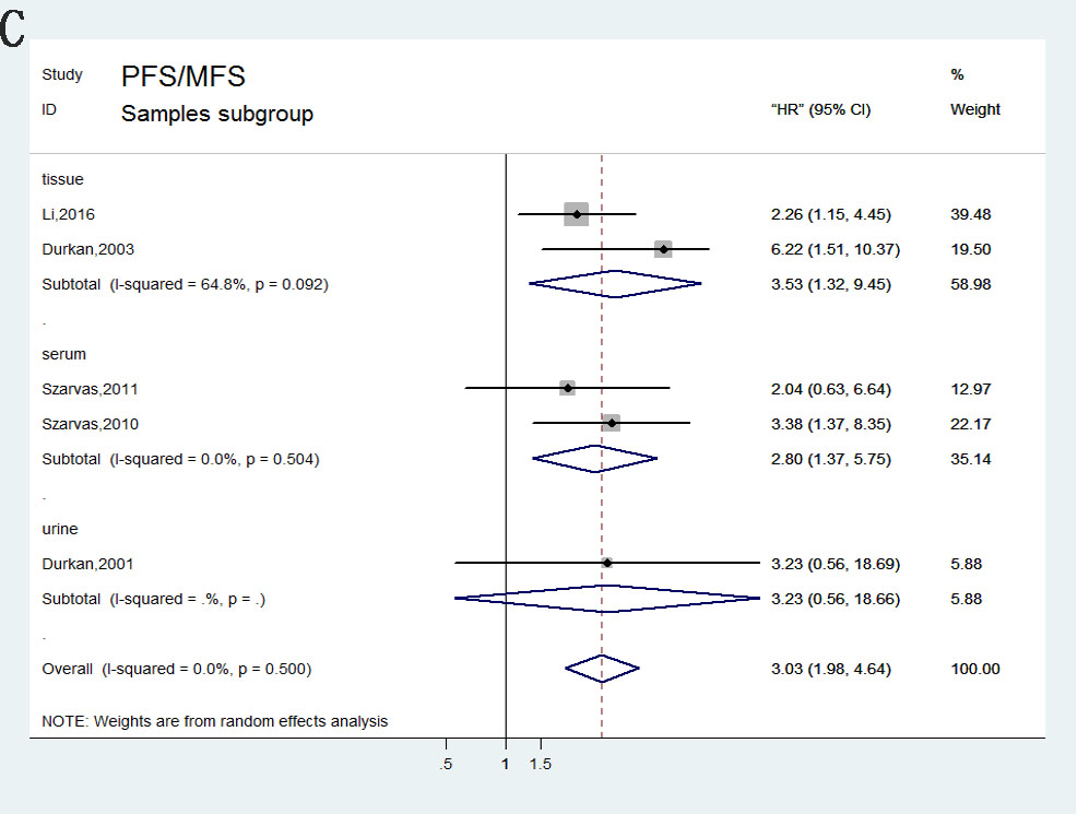 Figure 6: Forest plots of subgroup analysis of the PFS/MFS. A. stratified by MMPs subgroups; B. stratified by Assay methods; C. stratified by Sample subgroups.