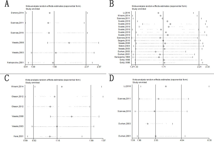 Figure 7: Sensitivity analysis under the specific model. A. effect of individual studies on the pooled HR for OS; B. effect of individual studies on the pooled HR for DSS/CSS; C. effect of individual studies on the pooled HR for DFS/RFS. D. effect of individual studies on the pooled HR for PFS/MFS.