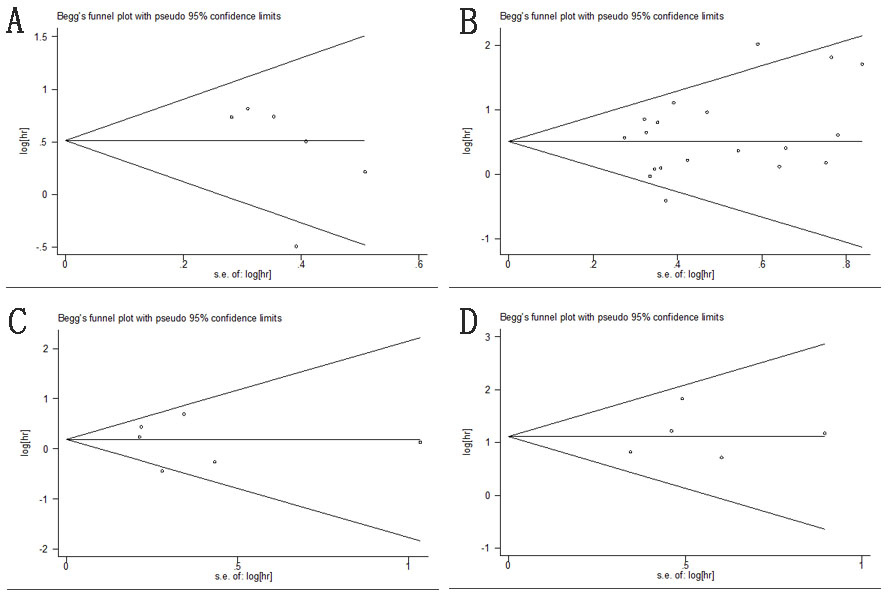 Figure 8: Begg’s funnel plots of publication bias test. A. OS; B. DSS/CSS; C. DFS/RFS; D. PFS/MFS.