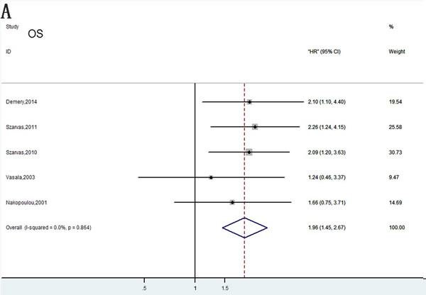 Among the seven studies reporting OS, a fixed-effects model was used to analyze the data because of no significant heterogeneity (P = 0.110, I2 = 44.3%). Therefore, we concluded that MMPs overexpression was significantly associated with poor OS outcome in bladder carcinoma(HR= 1.67; 95% CI= 1.26–2.22; Figure 2A).
