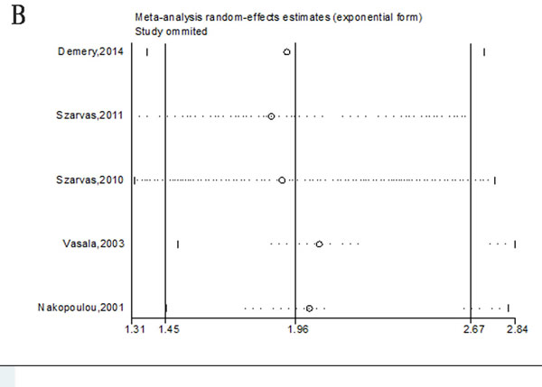 Figure 9: Meta-analysis of OS following exclusion of data from Vasala et al. (2008). A. Forest plots analysis of OS; B. Sensitivity analysis to confirmation of results’ stability; C. Publication bias to the evaluation of studies’ symmetry.