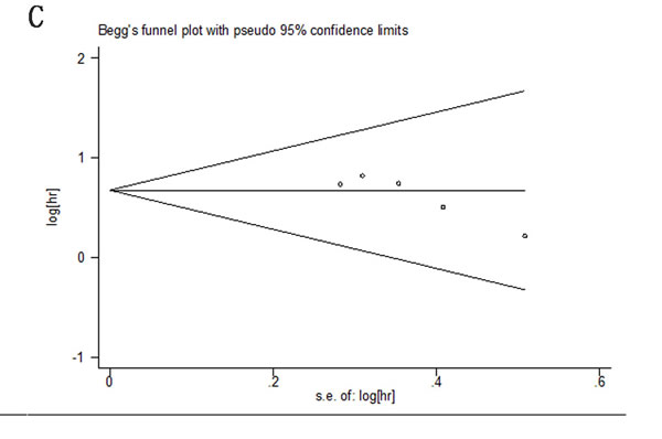 In order to reduce the effect of individual studies on final conclusions and evaluate the stability of results, a sensitivity analysis was performed by fixed-effect model. This test indicated that for DSS, DFS/RFS, and PFS/MFS, our results did not tend to exhibit alterations when an individual study was excluded (Figure 7). However, our analysis discovered that Vasala’s (2008) investigation had an obvious influence on OS result [17]. After excluding this data, a more convincing pooled HR and 95% CI was obtained (HR= 1.96, 95% CI= 1.45–2.67, Figure 9A) and heterogeneity decreased significantly (P = 0.864, I2 = 0%). In addition, results of sensitivity analyses and publication bias no longer changed anymore (Figure 9B, 9C).