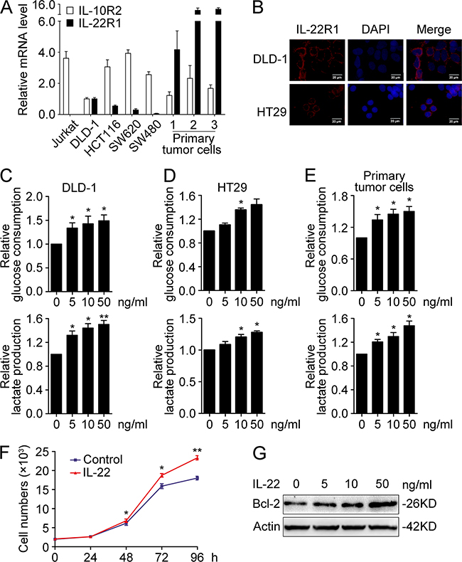 Figure 2: IL-22 promoted aerobic glycolysis associated with cellular proliferation in colon cancer cells. (A) Relative mRNA expression of IL-22R1 and IL-10R2 were determined in colon cancer cell lines (DLD-1, HCT116, HT29, SW480, SW620, and three primary tumor cells) and the lymphoma cell line Jurkat by RT-PCR. The mRNA expression in DLD-1 cells was used for the normal control. Actin was used as an internal reference. (B) The cellular localization of the IL-22R1 protein was determined in DLD-1 and HT29 cells by immunofluorescent assay. (C-E) Colon cancer cells were treated with either recombinant IL-22 (10ng/ml) or PBS for 24h. The culture supernatants were harvested and measured for D-glucose consumption (upper) and L-lactate production (down) in DLD-1 (C), HT29 (D) and primary tumor cells (E). (F-G) IL-22 enhanced cellular proliferation (F) and Bcl-2 protein expression (G) in DLD-1 cells. One representive result of three independent experiments was presented. *p< 0.05, **p< 0.01.