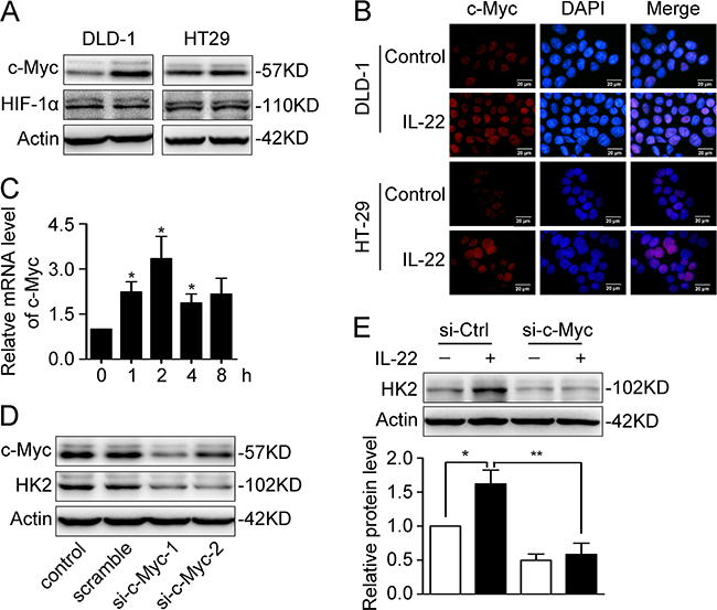 Figure 4: c-Myc was responsible for IL22-induced upregulation of HK2. (A) c-Myc and HIF-1α protein level was determined by Western Blot in DLD-1 and HT29 cells stimulated with either IL-22 or PBS. Actin served as loading control. (B) The cellular localization of the elevated c-Myc protein was determined by immunofluorescent assay in DLD-1 and HT29 cells stimulated witheither IL-22 (10ng/ml) or PBS for 4h. (C) c-Myc mRNA level was determined by RT-PCR in DLD-1cells stimulated with either IL-22 (10ng/ml) or PBS. Actin was used as an internal reference. (D) c-Myc was knocked down by siRNA in DLD-1 cells. (E) The elevated HK2 protein level induced by IL-22 was significantly decreased in si-c-Myc group compared with control group. One representive result of three independent experiments was presented. *p< 0.05, **p< 0.01.