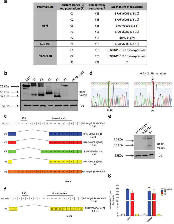 Figure 1: Mechanisms of acquired resistance displayed by vemurafenib-resistant clones and populations obtained from A375, 501 Mel and SK-Mel-28 cells. (a) Table that lists vemurafenib-resistant clones (C) and populations (P) and the corresponding resistance mechanism. The full list of known alterations that were searched for is reported in Supplementary Table 2. The resistance mechanism of SK-Mel-28 P1 population remains to be discovered. (b) Western blot for BRAFV600E protein in A375 parental cell line and vemurafenib-resistant clones (C) and populations (P). SK-Mel-197 cells, which are wt for BRAF, are included as a negative control. Immunoblotting for α-TUBULIN (TUB) is used as loading control. (c) Cartoon depicting the BRAFV600E splicing variants identified in A375 vemurafenib-resistant clones and populations. RBD: RAS-binding domain. (d) Electropherograms showing a single-nucleotide mutation (A→C) in the KRAS gene of A375 P2 resistant population (right) compared to A375 parental cell line (left), resulting in the K117N amino acid substitution. (e) Western blot for BRAFV600E protein in 501 Mel parental cell line and vemurafenib-resistant population (P1). SK-Mel-197 cells, which are wt for BRAF, are included as negative control. Immunoblotting for α-TUBULIN (TUB) is used as loading control. (f) Cartoon depicting the BRAFV600E splicing variant identified in 501 Mel P1. (g) In SK-Mel-28 C1 and C2 vemurafenib-resistant clones, EGFR and PDGFRβ are over-expressed, as detected by real-time PCR. The graphs represent the mean±SEM of 3 independent experiments. *p<0.05, **p<0.01.