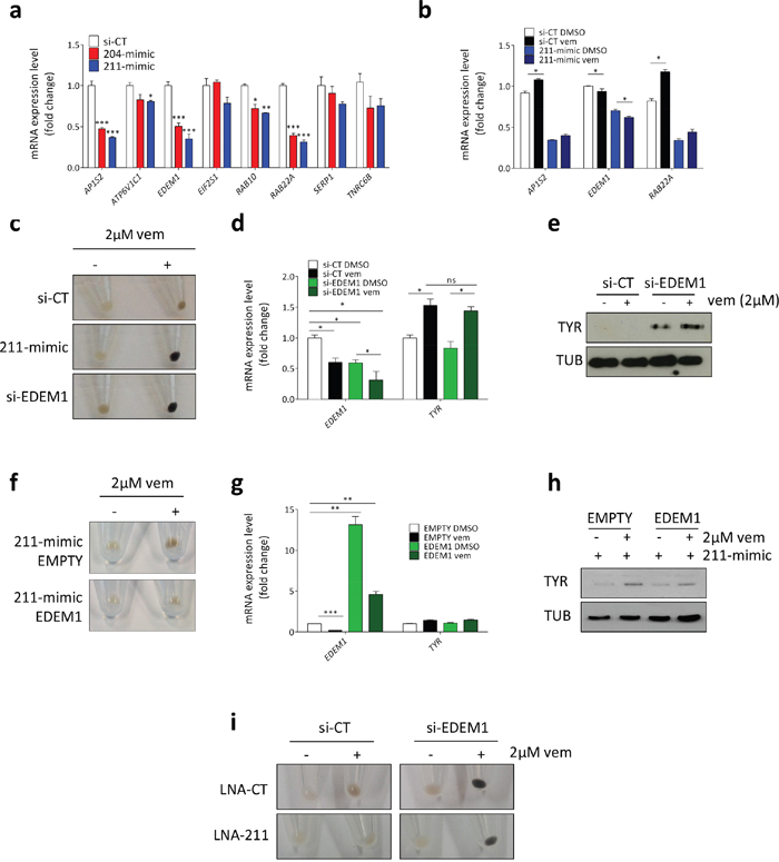 Real-time PCR analysis allowed us to confirm that in 501 Mel cells 211-mimic and 204-mimic cause the down-regulation of AP1S2, RAB10, RAB22A and EDEM1 (Figure 8a). Interestingly, AP1S2, RAB22A and EDEM1 have all an established link with TYR. The link with AP1S2 and RAB22A (Ras-Related Protein 22A) is positive. Specifically, they are involved in the trafficking of ATP7A, which in turn is the transporter that provides TYR with copper (an essential cofactor for its enzymatic activity) [44]. Conversely, the link between EDEM1 (Endoplasmic Reticulum Degradation Enhancer, Mannosidase Alpha-Like 1) and TYR is negative, because EDEM1 promotes the retrotranslocation of TYR from the ER into the cytoplasm and its subsequent degradation through the ER-associated degradation (ERAD) pathway [45, 46]. Therefore, we reasoned that EDEM1 represents a good fit to explain the post-transcriptional up-regulation of TYR caused by miR-211 (miR-211 causes the down-regulation of EDEM1, hence the accumulation of TYR protein). The first indication that EDEM1 is indeed the mediator of miR-211 pro-pigmentation activity came from the observation that there is a further decrease in its expression levels when the over-expression of miR-211 is combined with the treatment with vemurafenib (Figure 8b). Furthermore, we found that si-EDEM1 is able to recapitulate the increase in melanin content (Figure 8c) and the post-transcriptional increase in TYR levels (Figure 8d, 8e) observed after the transfection of 211-mimic. Analogous results were obtained by using the chemical inhibition of EDEM1 instead of its knock-down. Kifunensine (kif), a mannosidase inhibitor known to block EDEM1 activity and favor the accumulation of TYR [47], is able to phenocopy si-EDEM1 (Supplementary Figure 24). More importantly, we performed two rescue experiments that allowed us to demonstrate that miR-211 exerts its pro-pigmentation activity by acting through EDEM1. In Figure 8f-8h we show that the concomitant over-expression of the miRNA-insensitive ORF of EDEM1 impairs the increase in pigmentation caused by 211-mimic. Conversely, in Figure 8i we show that the impairment in pigmentation that occurs when endogenous miR-211 is inhibited by the LNA is strongly reduced by the concomitant knock-down of EDEM1.