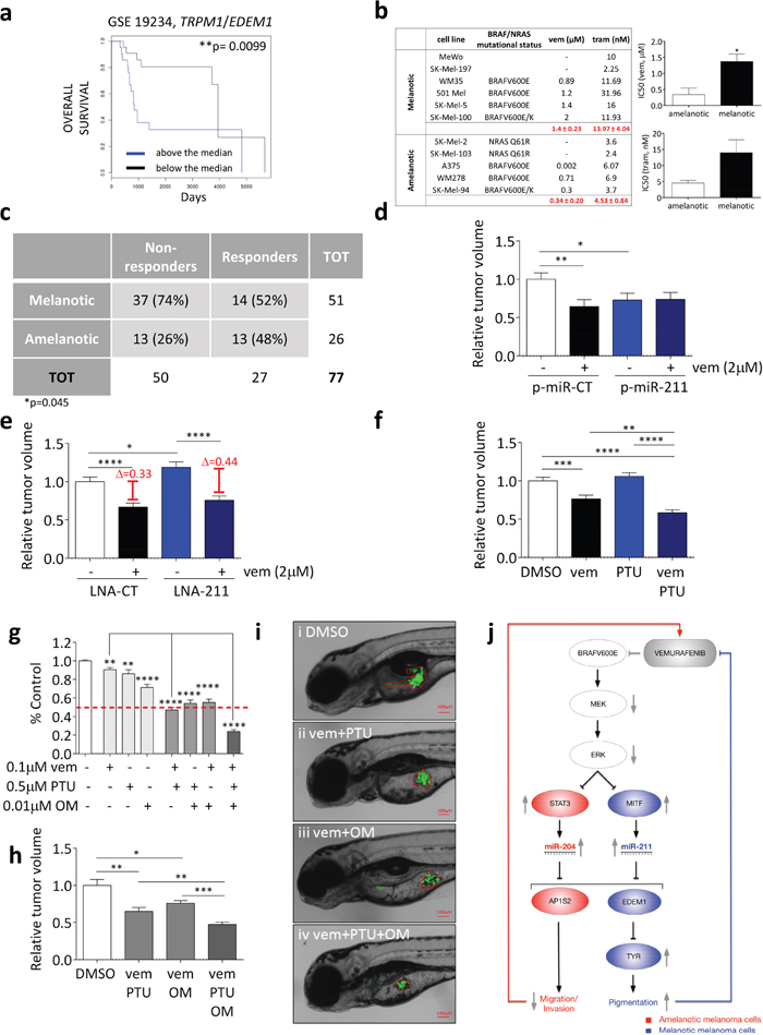 Figure 9: Pigmentation impairs the activity of BRAFi and MEKi. (a) Above the median (blue) and below the median (black) TRPM1/EDEM1 ratios allow to stratify metastatic melanoma patients according to their overall survival (GSE 19234). (b) IC50 of melanotic and amelanotic melanoma cell lines treated with vemurafenib (BRAFV600 E or K) and trametinib (BRAFV600 E or K, wt BRAF). (c) Response of 51 metastatic melanoma patients with melanotic tumors and 26 metastatic melanoma patients with amelanotic tumors to treatment with BRAFi or combined BRAFi/MEKi. Patients showing disease progression upon treatment were classified as non-responders, while patients showing stable disease, partial response or complete response upon treatment were classified as responders. The Fisher Exact Probability Test indicate that patients with melanotic metastases are significantly more likely to be non-responders to targeted therapy compared to patients with amelanotic metastases (p=0.045) (d) 501 Mel cells that stably over-express a control miRNA (p-miR-CT, white and black) or miR-211 (p-miR-211, blue and dark blue) were treated with DMSO or 2uM vemurafenib for 48h. They were then injected into the yolk sac of 48hfp zebrafish embryos. The masses of the xenografted tumors were measured 48h later. (e) 501 Mel cells transiently transfected with LNA-CT (white and black), or LNA-211 (blue and dark blue) were treated with DMSO or 2uM vemurafenib for 48h. They were then injected into the yolk sac of 48hpf zebrafish embryos. The masses of the xenografted tumors were measured 48h later. (f) 501 Mel cells were treated with DMSO (white), 0.2uM vemurafenib (black), 0.1uM PTU (blue) or 0.2uM vemurafenib plus 0.1uM PTU (dark blue) for 48h. They were then injected into the yolk sac of 48hpf stage zebrafish embryos. The masses of the xenografted tumors were measured 48h later. (g) Cell number upon the treatment of 501 Mel cells with 0.1uM vemurafenib, 0.5uM PTU and 0.01uM oligomycin (OM) or their combinations for one week. (h-i) 501 Mel cells were treated with DMSO (white), 0.1uM vemurafenib plus 0.5uM PTU, 0.1uM vemurafenib plus 0.01uM oligomycine or 0.1uM vemurafenib plus 0.5uM PTU plus 0.01uM oligomycine (dark grey) for 48h. They were then injected into the yolk sac of 48hpf zebrafish embryos. (h) The masses of the xenografted tumors were measured 48h later. (i) Representative pictures of the tumor masses. (j) Cartoon that summarizes the main findings of this article. miR-204 and miR-211 are negatively regulated by BRAFV600E through the ERK pathway and are under the transcriptional control of STAT3 and MITF, respectively. By targeting AP1S2, miR-204 is the mediator of the anti-motility activity exerted by vemurafenib on amelanotic cells. Conversely, by targeting EDEM1 and hence preventing TYR degradation through the ERAD pathway, miR-211 is the mediator of the pro-pigmentation activity exerted by vemurafenib on melanotic cells. Such an activity in turn limits the efficacy of vemurafenib itself. The graphs represent the mean±SEM of 3 independent experiments. *p<0.05, **p<0.01, ***<0.001, ***<0.001.