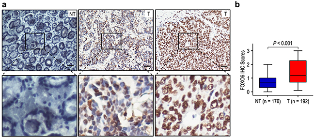 Figure 1: FOXO6 was significantly over-expression in gastric cancer. a. IHC assays of FOXO6 expression in 192 paired gastric cancer samples and adjacent non-tumorous tissues. The upper left panel represents low FOXO6 expression in adjacent non-tumorous tissues. The upper middle and right panel represents low and high FOXO6 expression in gastric cancer. Lower panels represent magnified pictures of boxed area in the corresponding upper panels. The scale bar represents 50 μm. b. FOXO6 expression levels were compared with gastric cancer and adjacent non-tumorous specimens. Statistical analysis was performed by Paired-Samples t-test.