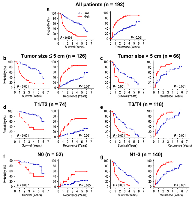 Figure 2: Overall survival and Recurrence-free survival are shown for gastric cancer patients. All patients were stratified according to tumor size, depth of invasion and lymph node metastasis. Kaplan-Meier survival estimates and log-rank tests were used to analyze the prognosis of FOXO6 expression in all patients a. and each subgroup b-g.