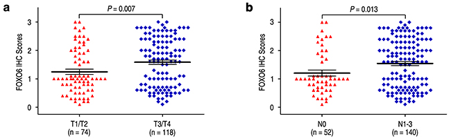 Figure 3: Comparsion of FOXO6 expression by depth of invasion and lymph node metastasis. FOXO6 expression is markedly increased both prominent serosal invasion group a. and lymph node metastasis group b.