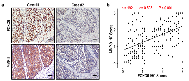 Figure 4: FOXO6 and MMP-9 levels correlated in 192 gastric cancer tissues. a. Serial sections of gastric cancer tissues were subjected to IHC staining with antibodies against FOXO6 and MMP-9. In case #1, high expression of FOXO6 in gastric cancer tissues was accompanied by elevated MMP-9. In case #2, low expression of FOXO6 was accompanied by the absence of MMP-9. The scale bar represents 50 μm. b. Spearman correlation analysis between FOXO6 and MMP-9 expression in 192 gastric cancer patients by IHC assays. FOXO6 expression was positively correlated with MMP-9 expression.