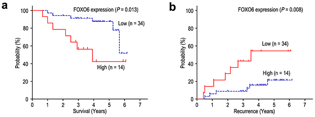 Figure 6: FOXO6 overexpression indicates poor prognosis in TNM stage I gastric cancer patients. Overall survival a. and Recurrence-free survival b. curves were generated based on the FOXO6 protein expression statuses in 48 TNM stage I patients.