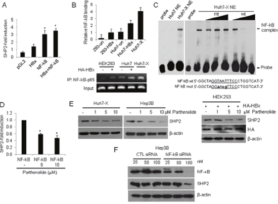 Figure 2: HBx activates the Shp2 promoter via an NF-κB–p65 binding site. (A) SHP2 promoter activities in HEK293 cells after transfection with Shp2–Luc and plasmids expressing HBx, NF-κB, or a combination of both for 48 h. Luciferase activity levels were normalized to Renilla luciferase units. Significance vs. control, *, P < 0.05 (n = 6). (B) ChIP analysis of NF-κB–p65 binding to the Shp2 promoter after HA–HBx overexpression for 24 h. (C) EMSA was performed with Huh7 and Huh7-X nuclear extracts using biotin-labeled probes containing the NF-κB binding site on the Shp2 promoter. Competition assays were performed using 1-fold, 10-fold, and 100-fold molar excesses of unlabeled wild-type (wt) and mutant (mut) oligonucleotides. (D) Shp2 promoter activities in NF-κB-overexpressing HEK293 cells after parthenolide treatment for 18 h. (E) Western blot analyses of SHP2 expression in Huh7-X, Hep3B and HEK293 cells after treatment with parthenolide. (F) Hep3B cells were transfected with a control siRNA or a NF-κB siRNA. After 48 h, the cells were analyzed by Western blot with anti-NF-κB and anti-SHP2 antibodies.