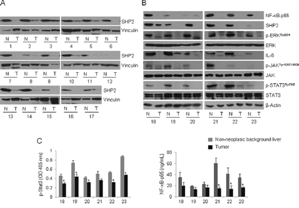 Figure 4: The NF-κB–SHP2–ERK and IL-6–JAK–SHP2 pathways are concomitantly increased in HBV-associated liver tissues. (A) Whole tissue lysates were prepared from 17 pairs of HBV-infected tumors (T) and matched non-neoplastic tissues (N), and analyzed by Western blot with anti-SHP2 antibodies. Vinculin served as a loading control. (A) NF-κB-p65, SHP2, p-ERK, ERK, IL-6, p-JAK, JAK, p-STAT3 and STAT3 levels were assessed by Western blotting in T/N tissues prepared as described in A. β-Actin was used as a loading control. (B) The whole tissue lysates described in (A) were assayed to determine the levels of p-STAT3 and NF-κB-p65. Columns represent the means of three independent experiments; bars indicate standard deviations (* P < 0.05). The numbers denote tissue numbers.