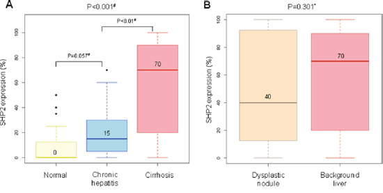 Figure 6: Representative levels of SHP2 immunoreactivity in livers without hepatocellular carcinoma. (A) SHP2 expression tends to increase gradually from normal livers to cirrhotic livers. (B) SHP2 expression is lower in dysplastic nodules than in matched non-neoplastic cirrhotic liver tissues. *, Wilcoxon matched-pairs signed ranks test and #, Wilcoxon rank sum test. The number above the histogram represents the mean value.