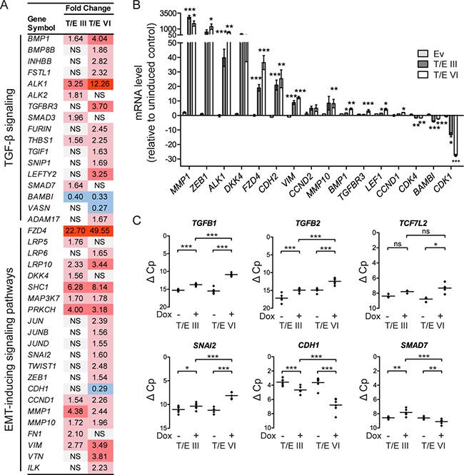 Figure 2: Transcriptional modulation in LNCaP-T/E cells. (A) Microarray gene expression data indicating activated TGF-β and EMT-inducing signaling pathways in T/E expressing cells. (B–C) qPCR validation of T/E-induced gene expression changes associated with an EMT profile. (B) mRNA expression after T/E induction relative to uninduced controls. (C) mRNA levels of selected targets showing prominent transcriptional modulation in T/E III and VI overexpressing cells. Data are shown as ΔC p values relative to GAPDH measured in the same samples, which had been used for the microarray analysis. Ev - Empty vector; NS/ns - not significant. Red - upregulated; blue - downregulated.