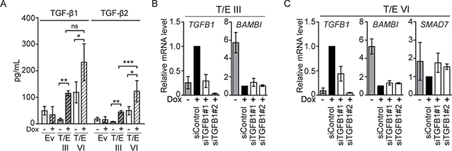 Figure 4: TGF-β signaling in LNCaP-T/E cells. (A) TGF-β1 and TGF-β2 released into the medium was determined in cell-free conditioned medium derived from Dox-induced (+) and uninduced (−) LNCaP-T/E cells, respectively. All Luminex results are presented as MFI (mean fluorescent intensity) values ± s.d. of three independent experiments. Ev - Empty vector. (B–C) siRNA-mediated knockdown of TGFB1 using 20 nM siRNA show upregulation of BAMBI in (B) T/E III and (C) T/E VI cells and additionally SMAD7 in T/E VI cells (C) as determined by qPCR.