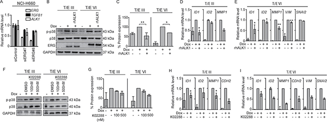 Since ALK1 mRNA was strongly upregulated in T/E overexpressing cells (40-fold in T/E III and 500-fold in T/E VI cells; Figure 2B), we analyzed this pathway in more detail. ERG knockdown in NCI-H660 cells led to reduced ALK1 mRNA levels (Figure 5A) confirming the association between ERG and ALK1 expression. Next, Dox-induced LNCaP-T/E cells were incubated with a human recombinant decoy receptor (rhALK1) [24] or the ALK1 inhibitor K02288 [25]. Disruption of ALK1 signaling using rhALK1 (Figure 5B and 5C) or K02288 (Figure 5F and 5G) resulted in reduced p38 phosphorylation. As expected [26, 27], the inhibitor of differentiation 1 (ID1), and ID2 genes were upregulated after ERG induction, but reduced after rhALK1 (Figure 5D and 5E) or K02288 (Figure 5H and 5I) treatment. These data suggested that T/E overexpression induces ALK1-signaling and supported the concept that ALK1-mediated phosphorylation of p38 confers mesenchymal transformation of PCa cells. In line with this, rhALK1-mediated inhibition of ALK1 signaling led to reduced expression of MMP1 (52% reduction) in T/E III (Figure 5D), and MMP1, VIM, and SNAI2 (39%, 22%, and 5% reduction, respectively) in T/E VI cells (Figure 5E). ALK1 inhibition by K02288 also resulted in reduced expression of MMP1 and CDH2 (35% and 61% reduction, respectively) in T/E III (Figure 5H) and MMP1, CDH2, VIM, and SNAI2 (72%, 50%, 40%, and 48% reduction, respectively) in T/E VI overexpressing cells (Figure 5I).