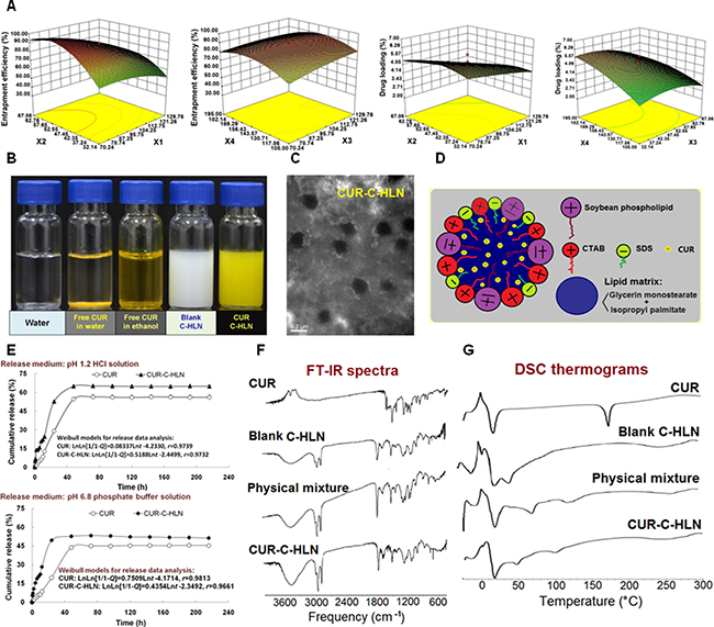 The optimal recipe for CUR-C-HLN was obtained using a four-factor and five-level CCD-RSM method [27, 28]. Our tests helped to understand the complex relationship between the variables (vesicular components) and the response (CUR content and encapsulation ratio). The encapsulation ratio of CUR-C-HLN was higher than that of the other core-shell delivery systems (such as mPEG-PCL micelles) [36] or lung-targeted delivery systems (such as gelatin microspheres) (88 ± 3.32% or 75.5 ± 3.82%) [37]. The infrared and calorimetric data of CUR-C-HLN suggested that CUR was successfully entrapped in the nano-particles.