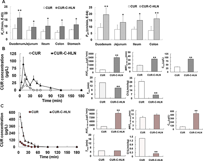 Figure 2: In situ absorptive and in vivo kinetic characteristics of CUR-C-HLN. (A) The absorption rate constant (Ka) and effective permeability (Peff) of CUR-C-HLN. (B) Plasma CUR concentration versus time profiles and pharmacokinetic parameters of CUR after oral administration at the dose of 15 mg/kg. (C) Plasma CUR concentration versus time profiles and pharmacokinetic parameters after intravenous injection at the dose of 2.5 mg/kg. The data are shown as the mean ± SD. n = 6 rats per group. *P < 0.05 or **P < 0.01 indicate significant differences between CUR-C-HLN and CUR.