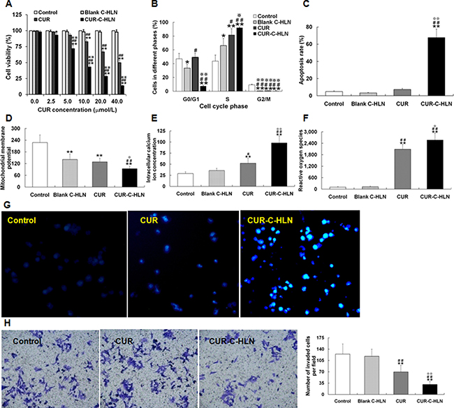 Figure 3: Effects of CUR-C-HLN on Lewis lung cancer cells. (A) Cell viability phase after 24 h’ exposure to different concentrations of CUR-C-HLN and free CUR. (B) cell cycle, (C) apoptosis rate, (D) mitochondrial membrane potential, (E) intracellular calcium ion levels and (F) reactive oxygen species of LLC cells after 24 h’ exposure to 20 μmol/L CUR-C-HLN and free CUR. (G) The inverted photomicrographs of LLC cells after 24 h’ exposure to 5 μmol/L CUR-C-HLN and free CUR. (H) Representative cellular field images of Matrigel-invaded LLC cells at 400× magnification, and bar graphs representing the average invaded cells per field. The results were presented as the mean ± SD (n = 3), *P < 0.05 for the test sample compared with negative control, #P < 0.05 for the test sample compared with Blank C-HLN, P < 0.05 for the test sample compared with free CUR.