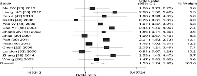 Figure 3: Forest plot of the the combined effects of GSTM1 and GSTT1 polymorphisms and lung cancer risk in Asians (dominant model).