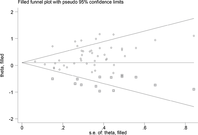 Figure 4: The Duval and Tweedie nonparametric “trim and fill” method’s funnel plot of the meta-analysis (dominant model).