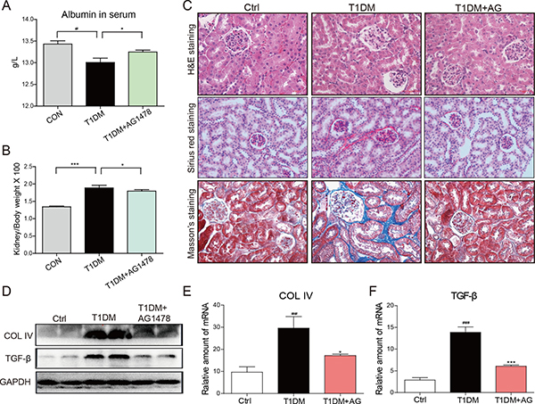 Figure 1: AG1478 attenuate diabetes-induced renal histological abnormalities and fibrosis. The effects of AG1478 on the metabolic profiles of STZ-induced mice: serum albumin (A) and kidney/body weight ratio (B) Serum albumin and kidney/body weight ratio were detected at the time of death. Data are mean ± S.E.M. (C) Administration of AG1478 significantly improved histologic abnormalities and fibrosis in the formalin-fixed renal tissues. Renal histopathologic analysis was performed using H&E staining (400×); representative figures of Sirius red staining and Masson trichrome staining (400×) on renal tissue. (D) Western blot analysis for Col4 and TGF-β1 protein expression in the renal tissue. (E and F) The mRNA expression of the Col4 and TGF-β1 in the renal tissues was measured by real-time qPCR. (Eight mice in each group were used for above analysis; *P < 0.05, ***P < 0.001 versus DN; #P < 0.05, ##P < 0.01, ###P < 0.001 versus vehicle control (Ctrl)).