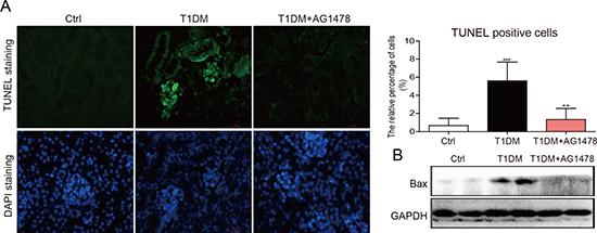 Figure 2: AG1478 mitigate apoptosis in diabetic kidney. (A) Representative images for TUNEL staining in renal tissue sections. Statistic data of TUNEL positive cell was shown, data were presented as mean ± SDs; (B) Western blot analysis for the protein expression of apoptosis-related proteins Bax in renal tissues. (Eight mice in each group were used for above analysis. **P < 0.01 versus DN; ###P < 0.001 versus vehicle control (Ctrl)).