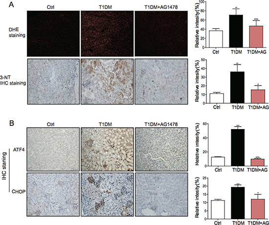 Figure 4: AG1478 attenuate diabetes-induced oxidative stress and endoplasmic reticulum stress. (A) Representative images for DHE staining using the formalin-fixed renal tissues as described in materials and method (200× magnification). Representative images for immunohistochemial staining of 3-NT accumulation using the formalin-fixed renal tissues as described in materials and methods section(200× magnification). And statistic figure was shown, data were presented as mean ± SDs. (B) Representative images for immunohistochemical staining of ATF4 and CHOP accumulation using the formalin-fixed renal tissues as described in Materials and methods (200× magnification). And statistic figure was shown, data were presented as mean ± SDs. (Eight mice in each group were used for above analysis. *P < 0.05, ***P < 0.001 versus DN; ##P < 0.01, ###P < 0.001 versus vehicle control (Ctrl)).