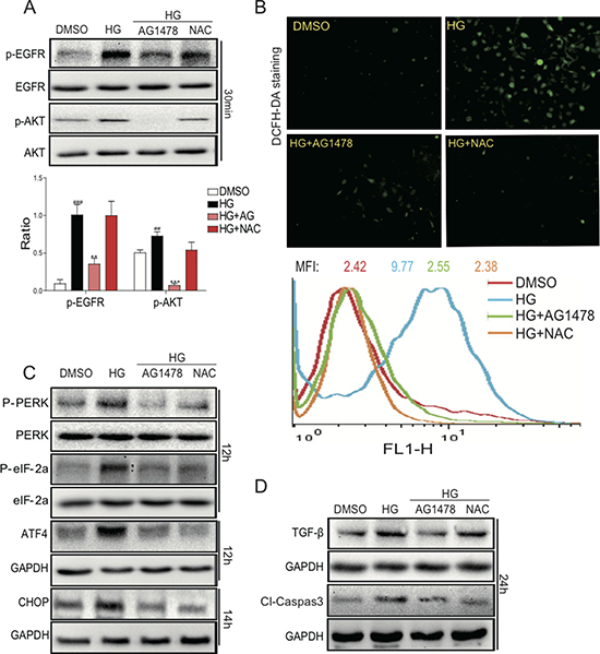 AG1478 and NAC inhibited HG-induced ROS generation, ER stress, apoptosis, and fibrosis
