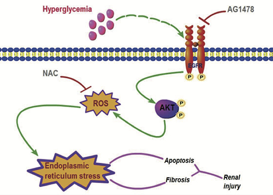 In conclusion, we demonstrated that EGFR plays a pivot role in diabetic nephropathy pathogenesis via up-regulating ROS generation and ER stress. Inhibition of EGFR attenuates damage of DN through EGFR/AKT/ROS/ER stress signaling, which could be a potential therapeutic target in diabetic kidney diseases.