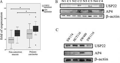Figure 1: USP22 and AP4 expression in CRC tissues and cells. (A) Western blot analysis of USP22 and AP4 levels in 19 pairs of non-cancerous mucosa and primary carcinoma. Both USP22 and AP4 were overexpressed in primary carcinoma relative to their expression in matched non-cancerous mucosa. (B) Four pairs of samples are shown as representative examples. (C) USP22 and AP4 protein levels were assessed in the CRC cell lines, containing SW174, HCT116, SW480 and SW1116, by western blot (WB). Significance level as indicated: *p < 0.05.